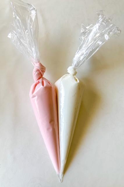 Tarvitset pupuja varten ainakin valkoista sekä vaaleanpunaista 10-15 sekunnin pikeeriä, sekä lisäksi mustaa vähän paksumpaa pikeeriä silmiä varten. Vaihtoehtoisesti voit piirtää pupulle silmät ja suun mustalla elintarviketussilla, joita myydään leivontatarvikekaupoissa. Itse maalasin pupuilleni silmäripset ja suut mustalla elintarvikevärillä siveltimen avulla. Tarvitset myös pikeeripiikin eli välineen, jolla pikeeriä on helppo levittää ja tasoittaa. Hyvänä vaihtoehtona myös cocktailtikku ajaa saman asian. Lisäksi on hyvä varata vierelle talouspaperia, johon pyyhkiä pikeeripiikkiä joka käytön välissä. Keksi kannattaa myös koristella talouspaperin päällä, siinä sitä on helppo käännellä paperista kiinni pitäen.