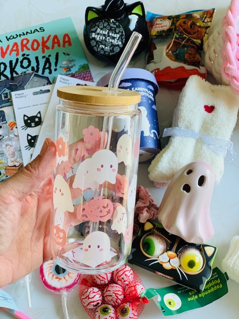 Itse ilahduin erityisen paljon Tokmannin Miny-osastolta ostamastani kummitus- ja kurpitsakuvioisesta juomalasista, jossa on hauska lasipilli ja kansi. Juon joka aamuisen jääkahvini nykyään tästä lasista. Myynnissä oli myös samoja laseja pipariukkelikuviolla, jonka ostin toki itselleni joulunaikaa varten.