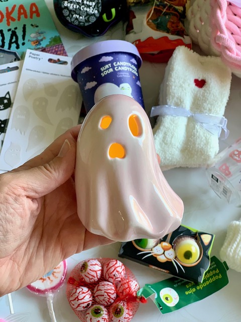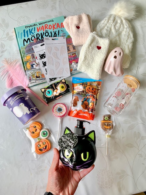 Täällä Suomessa kaupoista on yleensä löytynyt pääasiassa vain kertakäyttöisiä ja huonolaatuisia halloweentavaroita, joita en itse halua tähän hemmottelukoriin laittaa. Onneksi tänä vuonna erityisesti Flying Tiger ja Tokmanni ovat yllättäneet positiivisesti. Molemmista kaupoista löysin vaikka mitä ihanaa kummittelukoria varten. Tein löytöjä myös Normalista ja H&M:stä. Ja jos oikein haluaisi panostaa, kannattaisi tilata tuotteita hyvissä ajoin ulkomailta. Mutta se tässä korissa onkin hauska juttu, että sen saa kerättyä pienelläkin rahalla ex-tempore. Ja halutessaan voi laittaa suuremman summan, ihan oman budjetin mukaan.