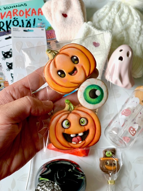 Jotain syötävää onkin sitten se helppo kohta tällä listalla. Kaupoista löytyy vaikka kuinka paljon kaikenlaisia halloweenkarkkeja ja -suklaita. Muista huomioida lahjansaajan allergiat ja ruokavalio. Herkut voivat olla myös itse tehtyjä. Lisäksi voi laittaa mukaan myös jotain herkullista juotavaa. Herkut voivat toki olla myös suolaisia ja terveellisiä, koska kaikki eivät sokerista välitä. Nämä itsetehdyt keksit ovat gluteenittomia ja koristeltu pikeerillä sekä käsinmaalattu elintarvikeväreillä.