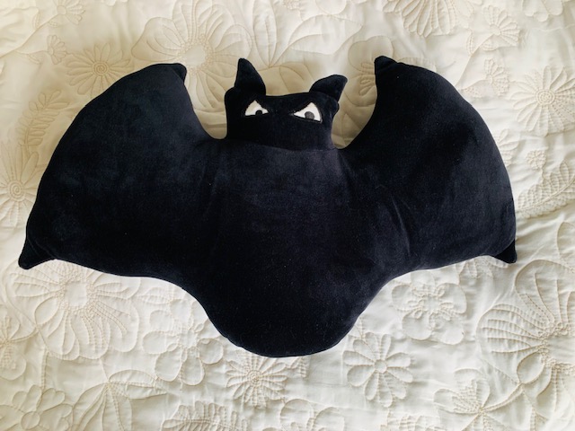 Jokin pieni ja pehmeä voisi olla kurpitsakuvioiset sisätossut, hauskat halloweensukat tai pehmoiset villasukat varpaita lämmittämään kylminä syysiltoina. Halloweensukkia ja -vaatteita tuntuu olevan vaikea löytää aikuisille, joten tässä kohtaa täytynee improvisoida, tilata ulkomailta netin kautta tai sitten tyytyä neutraaleihin sävyihin. Lasteni koreihin tuli pehmoiset lämpösukat talvea varten. Niistä ei nyt ole kuvaa, mutta tässä lepakkotyyny.